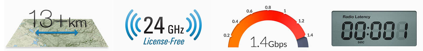 AirFiber 24 Devrimsel INVICTUS işlemcisi ve 24GHz lisans gerektirmeyen(Freeband) teknolojisi ile 13KM+ Uzaklığa kadar 1,4 GBPS TCP bant genişliği sağlamaktadır.
