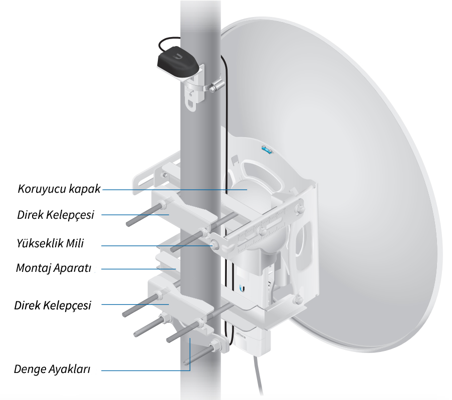 Montaj Opsiyonu Standart Direk Montaj Ayarları, airFiberX Bracket, ve Weatherproof RF Kulakçıkları kutu içeriğine dahildir.,